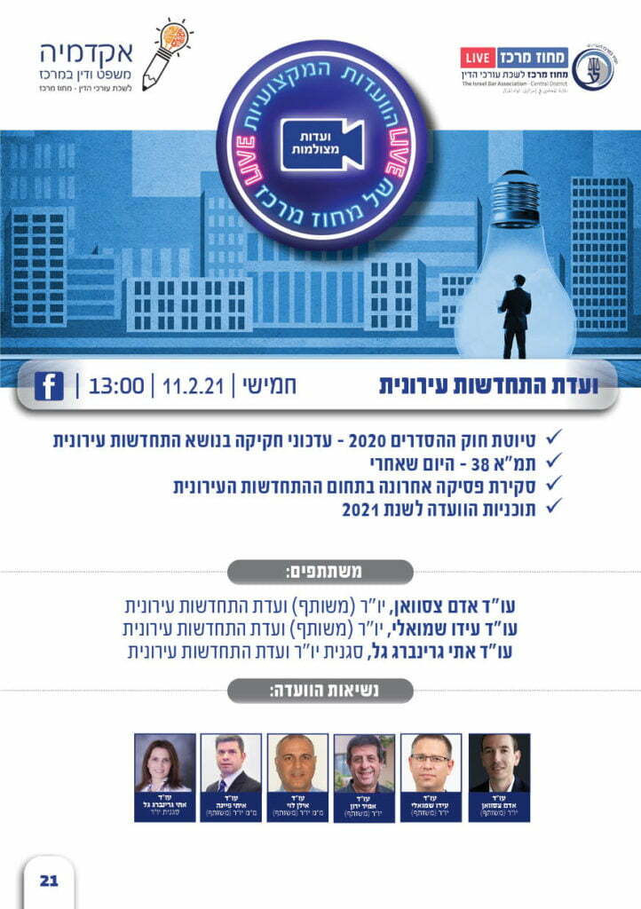 מיזם ישיבות ועדות מקצועיות מצולמות בשידור חי ועדת התחדשות עירונית 11 2 21 יום חמישי 13 00 מחוז מרכז לשכת עורכי הדין
