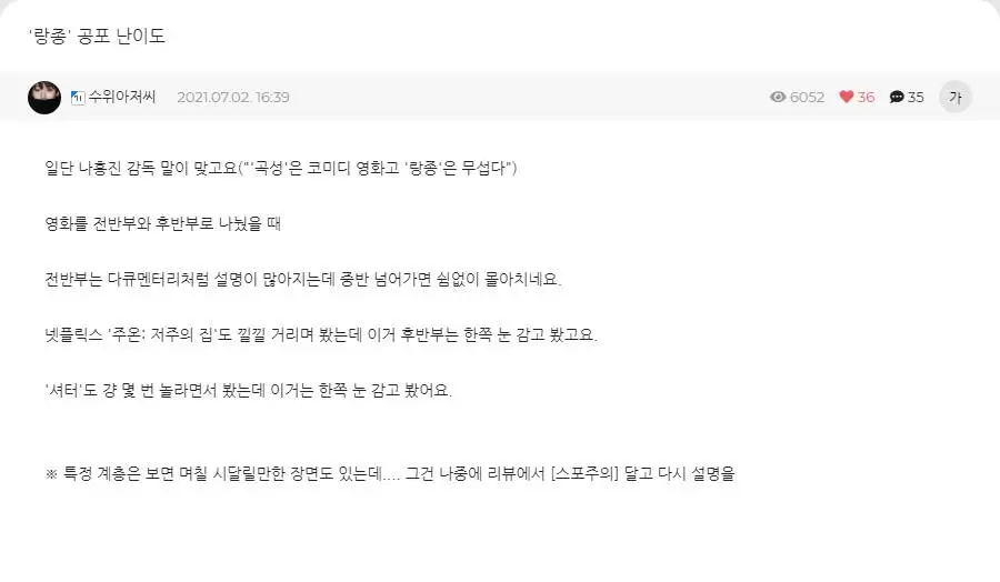 을 봤을 때도 그랬지만 영화 을 보고 나서도 내 머릿속엔 물음표가 한가득이었다. 리뷰 - 실패한 공포영화 스포일러 있습니다. 나홍진 감독의 전 작품인 곡성도 굉장히 소름돋고 재미있게 잘 봤던 터라 이번 작품인 랑종도 빠르게 보고 후기를 남기려고 합니다.